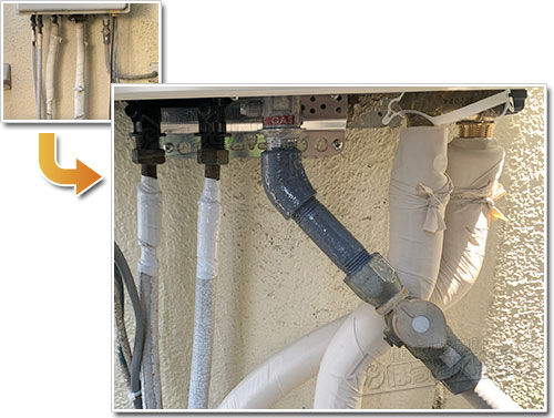 ほっとハウスでは、給湯器本体の下を通る配管すべてを確認し、