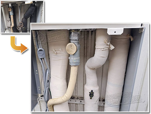 ほっとハウスでは、交換時に本体下の配管部分へ保温材とキャンパステープをしっかりと施工。