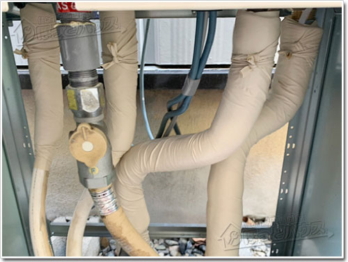 給湯器下部の配管には、専用の保温材を巻き直し、その上からキャンパステープで仕上げることで、機能性と耐久性の両方を確保しています。
