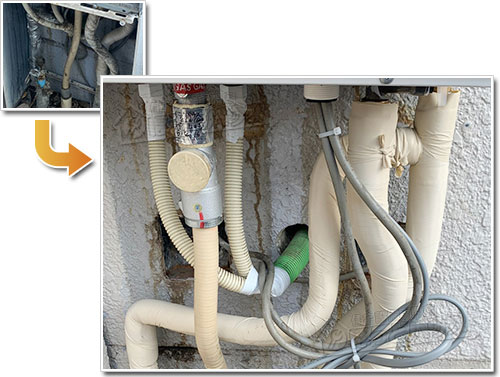 ほっとハウスでは、本体下に通る配管へ給湯器専用の保温材を確実に施工し、その上からキャンパステープで密着させる工程を標準としています。