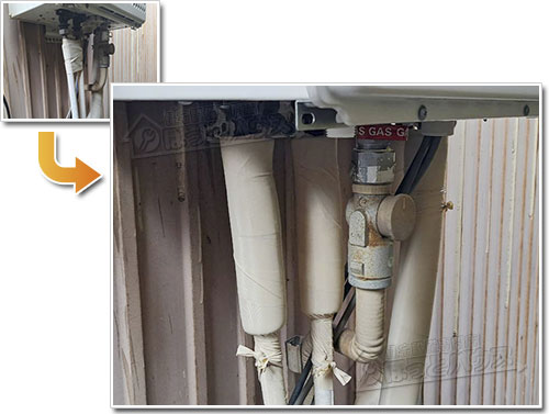 現場によっては、エアコン用の白い保温材が給湯器配管に使われている例も見受けられます。