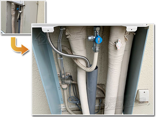 ほっとハウスでは、本体下部を通る配管に給湯器専用の保温材を確実に施工し、仕上げとしてキャンパステープで密着させる工程を標準としています。