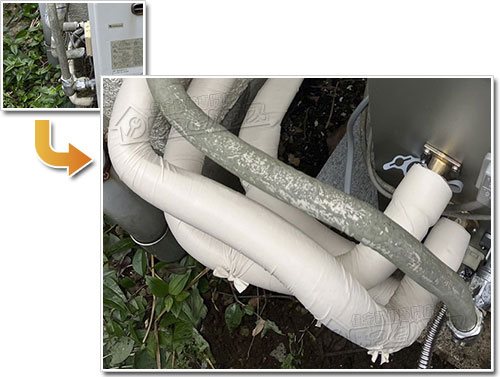 給湯器と接続される配管部分まで確認し、専用の保温材を巻き直したうえで、キャンパステープで丁寧に仕上げています。