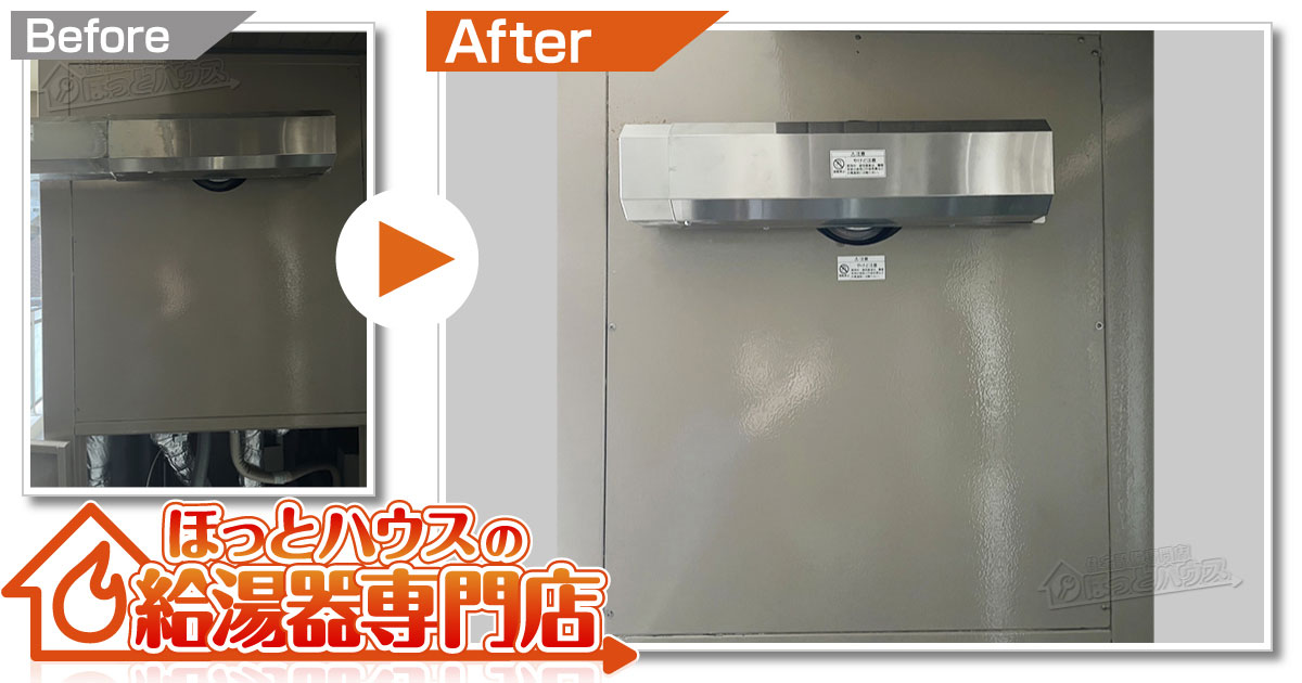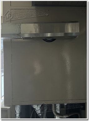 既存のガス給湯器は本体から排出される熱が丸い排気筒からでるタイプですが、その先にさらに左右に熱がいくように部材がついているタイプで非常に珍しい形で設置されていました。