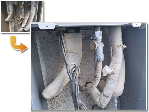 本体下部に集まる配管一本一本に対し、専用の保温材を巻き直し、キャンパステープで丁寧に保護したうえで配管カバーを設置します。