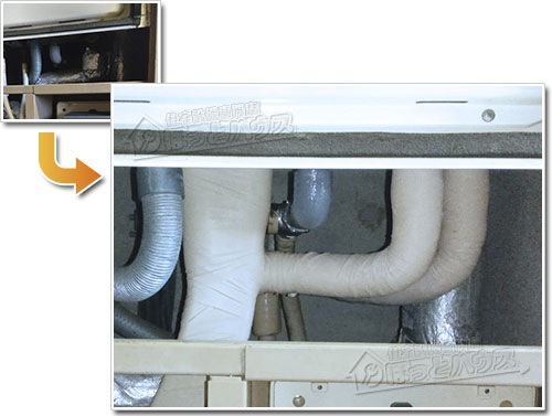 ほっとハウスでは、配管まわりの断熱作業を標準施工とし、専用保温材と化粧テープ(キャンパス)で丁寧に仕上げています。