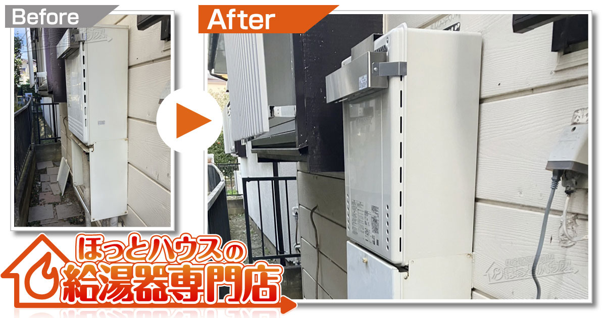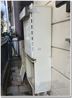 神奈川県相模原市南区E様邸のガス給湯器はお隣様との距離が近かったため、給湯器本体から排出される熱が前に行かないように、上方に抜ける排気アダプターを設置しました。