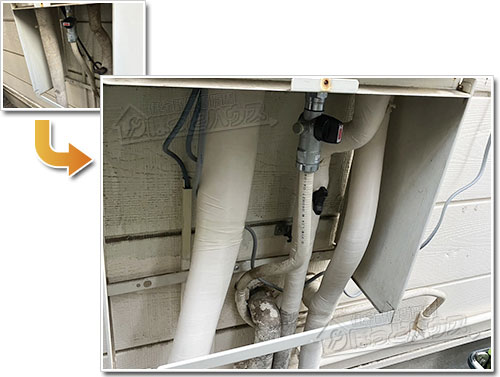 ほっとハウスでは、給湯器下の配管に専用の保温材とキャンパステープを施し、さらに配管カバーで外部をしっかり保護。