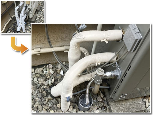 ほっとハウスでは、交換した給湯器を長く快適にご使用いただけるよう、配管部分の断熱施工を一つひとつ丁寧に実施しています。
