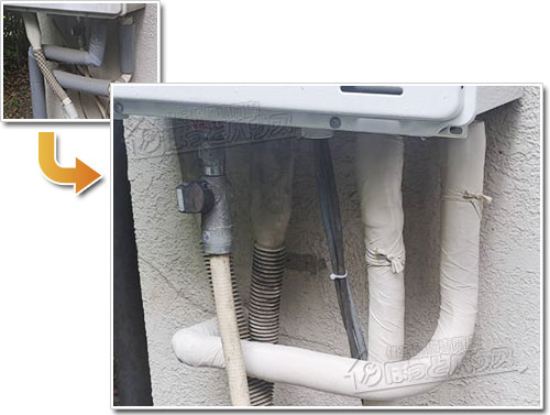 ほっとハウスでは、給湯器の交換時に本体下部の配管へ専用の保温材とキャンパステープを丁寧に施工しています。
