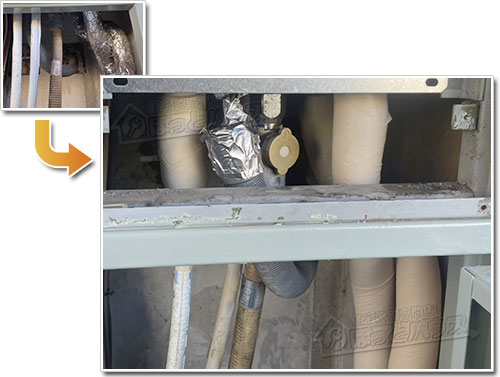 給湯器本体の下部にある配管部分には、専用の保温材とキャンパステープを使用。