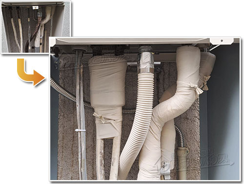 ほっとハウスでは、交換時に本体下の配管部分へ専用の保温材とキャンパステープを丁寧に施工しています。