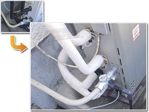 ほっとハウスでは、配管に専用の保温材を巻き直し、さらに化粧テープで丁寧に仕上げます。