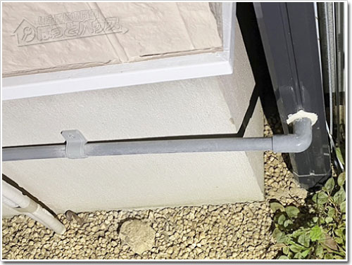 そこで給湯器横の雨どいに穴を開け、正規の配管ルートへ接続し、ようやく理想的な排水状態へ改善できました。