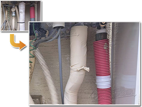 ほっとハウスでは、給湯器の交換時に本体下部の配管へ専用保温材とキャンパステープを用いた断熱施工を行っています。