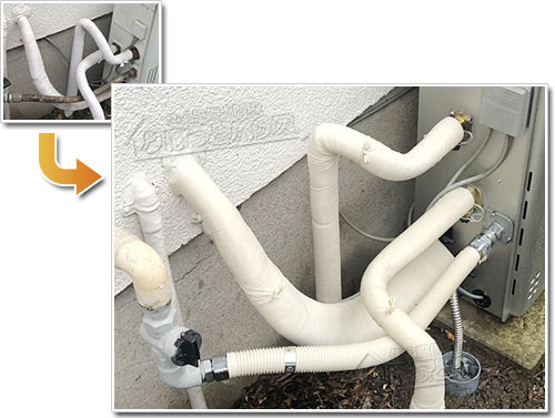 給湯器と接続される配管部分まで必ず確認し、給湯器専用の保温材を巻き直したうえで、キャンパステープにより丁寧に仕上げています。
