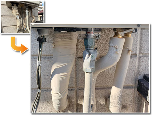 給湯器交換の現場では、本来適していないエアコン用の白い保温材が使われているケースもあります。見た目は整っていても断熱性能が十分ではなく、冬場の凍結防止という本来の役割を果たせないことがあります。