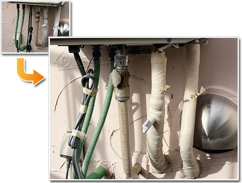 ほっとハウスでは、給湯器下部の配管に専用の保温材を丁寧に巻き直し、その上からキャンパステープで仕上げています。普段は目にすることのない部分ですが、このひと手間が凍結防止や劣化抑制につながり、設備全体の安定した使用を支えます。