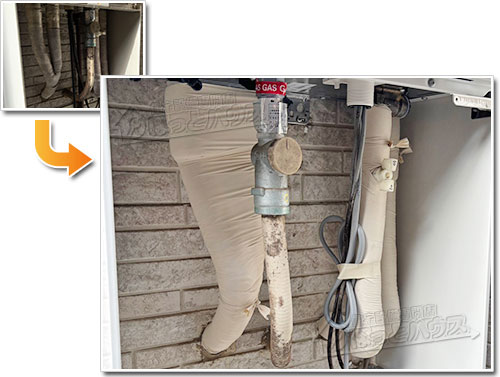一部では、給湯器に適さない白いエアコン用保温材が使用されている事例も見られます。外観は厚みがあり問題なさそうに見えても、断熱性能が十分ではなく、寒冷時の凍結や素材劣化の要因となる可能性があります。