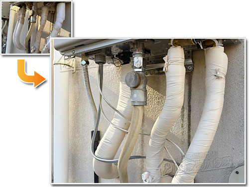 ほっとハウスでは、機器下部の配管に対して専用の保温材を使用し、その上からキャンパステープで丁寧に仕上げることで、断熱性と耐久性の両立を図っています。
