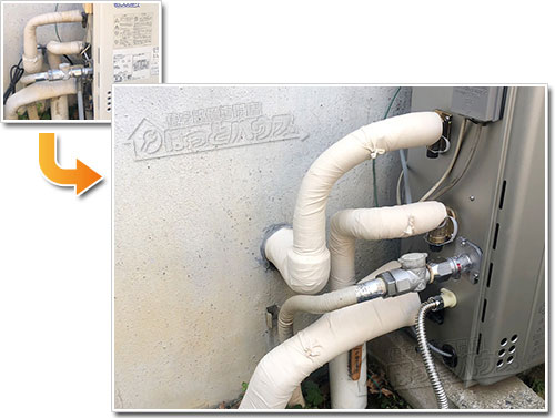 ほっとハウスでは、交換後の給湯器を長く安心してお使いいただくために、本体下部の配管へ専用保温材を丁寧に巻き直し、その上からキャンパステープで仕上げています。