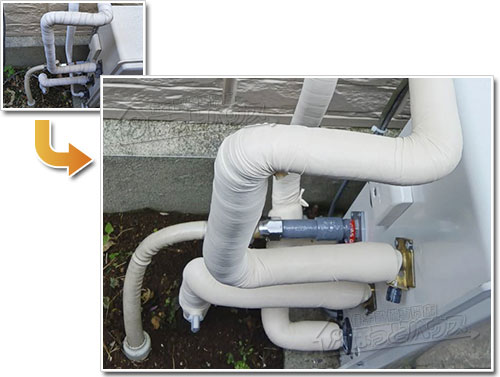 ほっとハウスでは、給湯器の配管に専用の保温材を丁寧に巻き直し、その上からキャンパステープで仕上げる工程を標準施工としています。