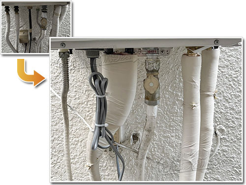 給湯器まわりの配管には専用保温材と粘着性の高いキャンパステープを使用し、熱を逃がしにくい状態へ仕上げています。