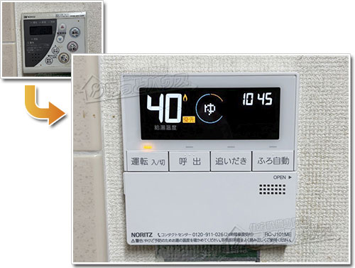 給湯器の交換とあわせて、浴室リモコンと台所リモコンも新しいモデルへ取り替えました。