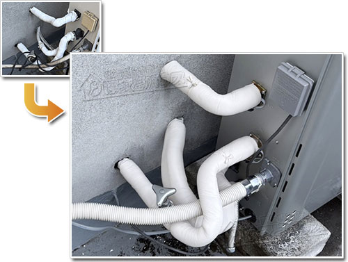 給湯器の下部にある配管には、専用の保温材とキャンパステープを丁寧に施工。