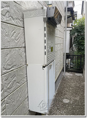 埼玉県所沢市K様邸のガス給湯器は隣家との距離が比較的近かったため、給湯器本体から排出される熱が前に行かないように、上方向に逃がす