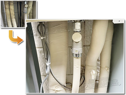 本体下部の配管へ専用保温材とキャンパステープ(化粧テープ)を丁寧に巻き直しています。