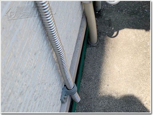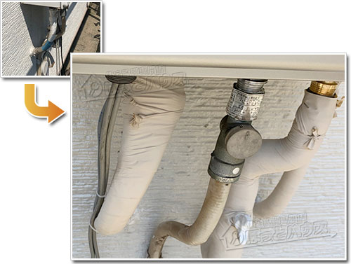ほっとハウスでは、配管一本一本に専用の保温材を巻き直し、さらに化粧テープで丁寧に仕上げています。