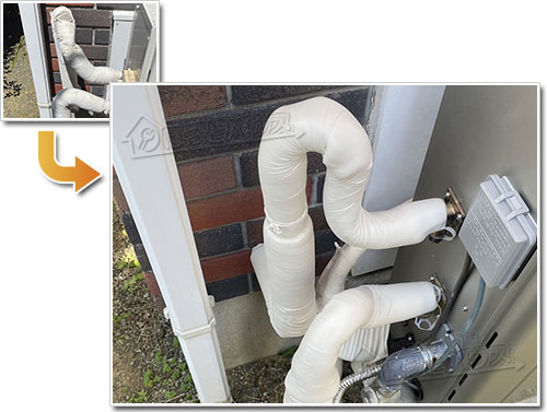 給湯器とつながる配管部分にも目を向け、専用の保温材を巻き直し、キャンパステープで丁寧に仕上げています。