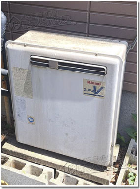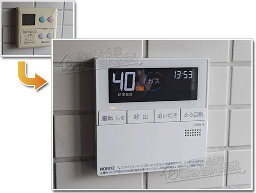 にお住まいのF様邸にて、リンナイ製ガス給湯器「 RFS-V2401A 」二つ穴24号フルオートタイプ(浴室隣接設置型)を、ノーリツ製「 GT-C2472SAR-1 BL