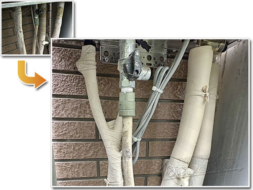 専用の保温材を巻き直し、その上からキャンパステープで仕上げることで、凍結と劣化の両方を防ぎます。