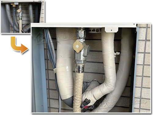 ほっとハウスでは、交換後の給湯器をできるだけ長く良好な状態で使っていただくため、本体下部の配管に専用の保温材を巻き直し、さらにキャンパス(化粧テープ)で丁寧に仕上げています。